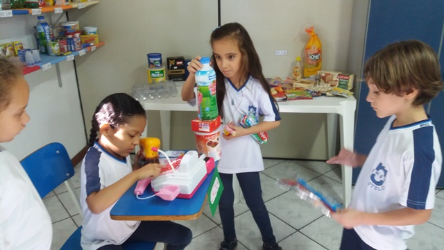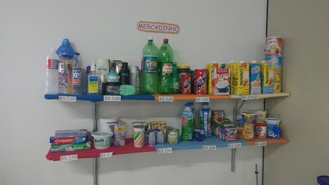 Utilizamos embalagens vazias, trazidas pelos alunos que se tornaram clientes e funcionários do “Mercadinho Castelinho”.
