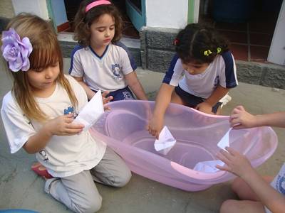 Os alunos fizeram uma dobradura de papel de um barquinho, levaram para a banheira com água e verificaram se flutuava ou não.
