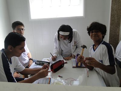 Fazendo uso das propostas do livro de Ciências do 9º ano, os alunos das turmas 901 e 902, sob a supervisão da professora Ana Maria, realizaram no laboratório vários experimentos onde aprenderam diversos modos de ligar uma ou mais lâmpadas a uma pilha; montar uma ligação em série; ligação em paralelo; um protótipo de interruptor e mostragem na variação de uma corrente elétrica. Essa proposta tem por objetivo desenvolver as habilidades quanto ao planejamento e execução de inúmeros experimentos a fim de obter informações ou testar hipóteses previamente elaboradas, resolvendo problemas do cotidiano.